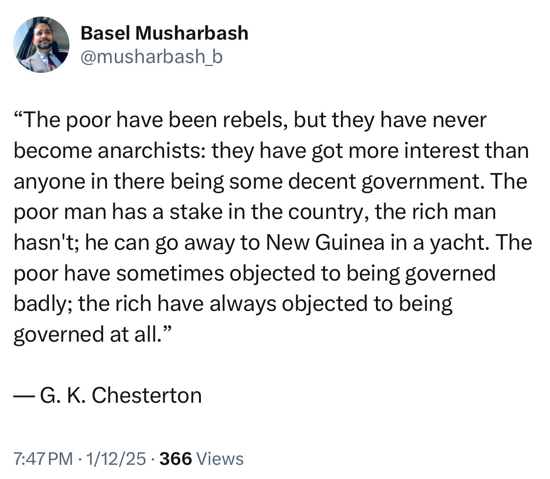 Screenshot of tweet by Basel Musharbash “The poor have been rebels, but they have never become anarchists: they have got more interest than anyone in there being some decent government. The poor man has a stake in the country, the rich man hasn't; he can go away to New Guinea in a yacht. The poor have sometimes objected to being governed badly; the rich have always objected to being governed at all.” –– G. K. Chesterton