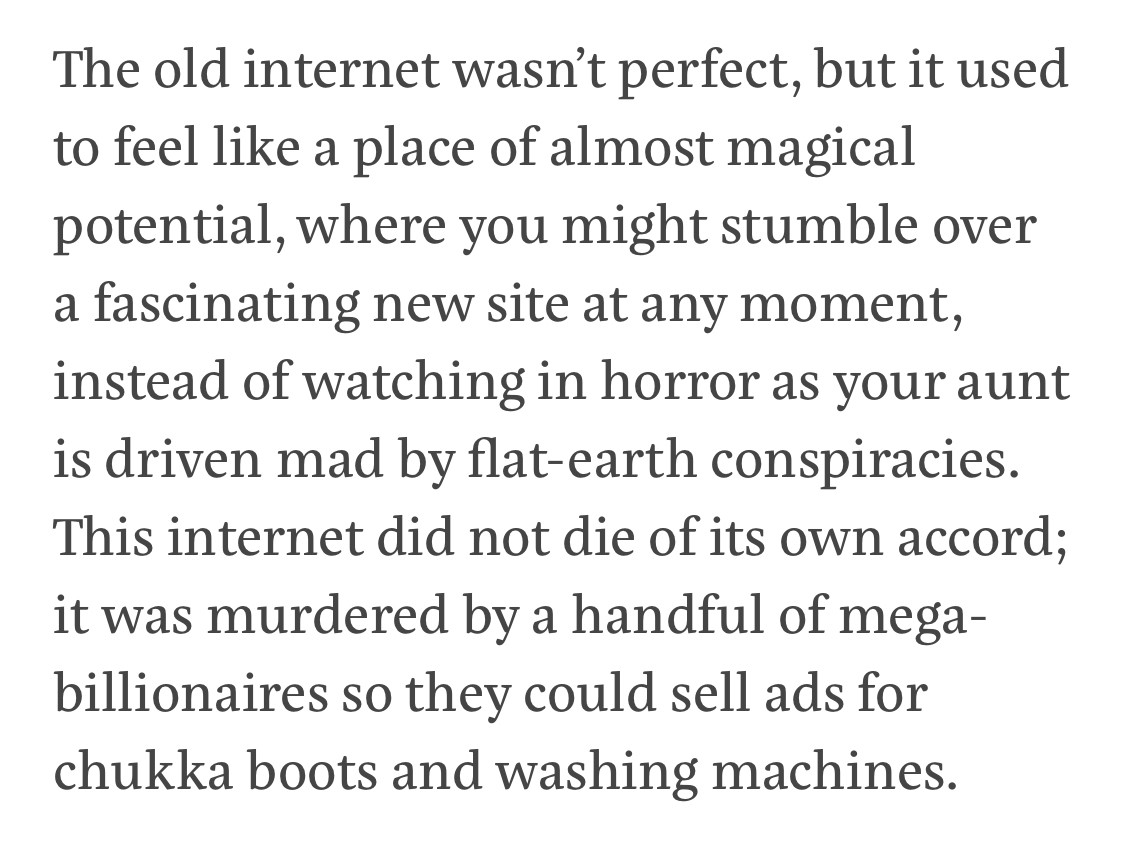 Text: The old internet wasn’t perfect, but it used to feel like a place of almost magical potential, where you might stumble over a fascinating new site at any moment, instead of watching in horror as your aunt is driven mad by flat-earth conspiracies. This internet did not die of its own accord; it was murdered by a handful of mega-billionaires so they could sell ads for chukka boots and washing machines.