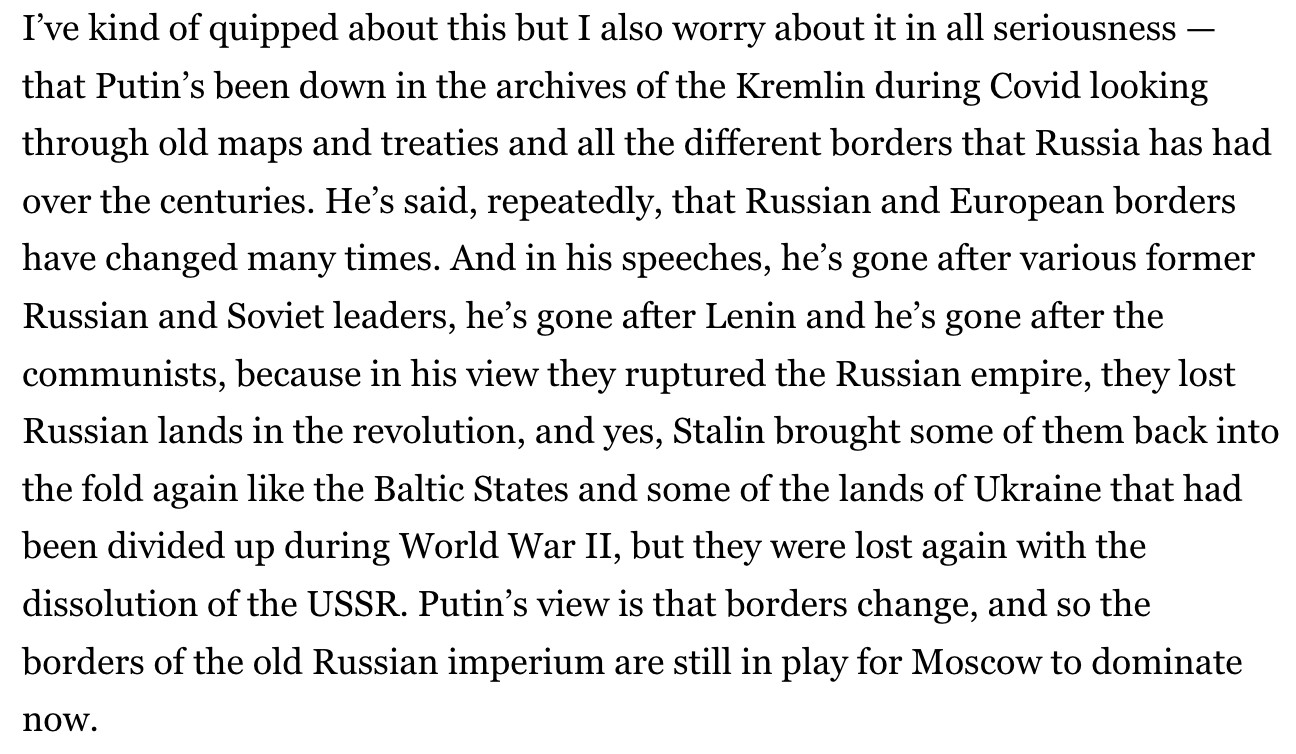Text: I’ve kind of quipped about this but I also worry about it in all seriousness — that Putin’s been down in the archives of the Kremlin during Covid looking through old maps and treaties and all the different borders that Russia has had over the centuries. He’s said, repeatedly, that Russian and European borders have changed many times. And in his speeches, he’s gone after various former Russian and Soviet leaders, he’s gone after Lenin and he’s gone after the communists, because in his view they ruptured the Russian empire, they lost Russian lands in the revolution, and yes, Stalin brought some of them back into the fold again like the Baltic States and some of the lands of Ukraine that had been divided up during World War II, but they were lost again with the dissolution of the USSR. Putin’s view is that borders change, and so the borders of the old Russian imperium are still in play for Moscow to dominate now.
