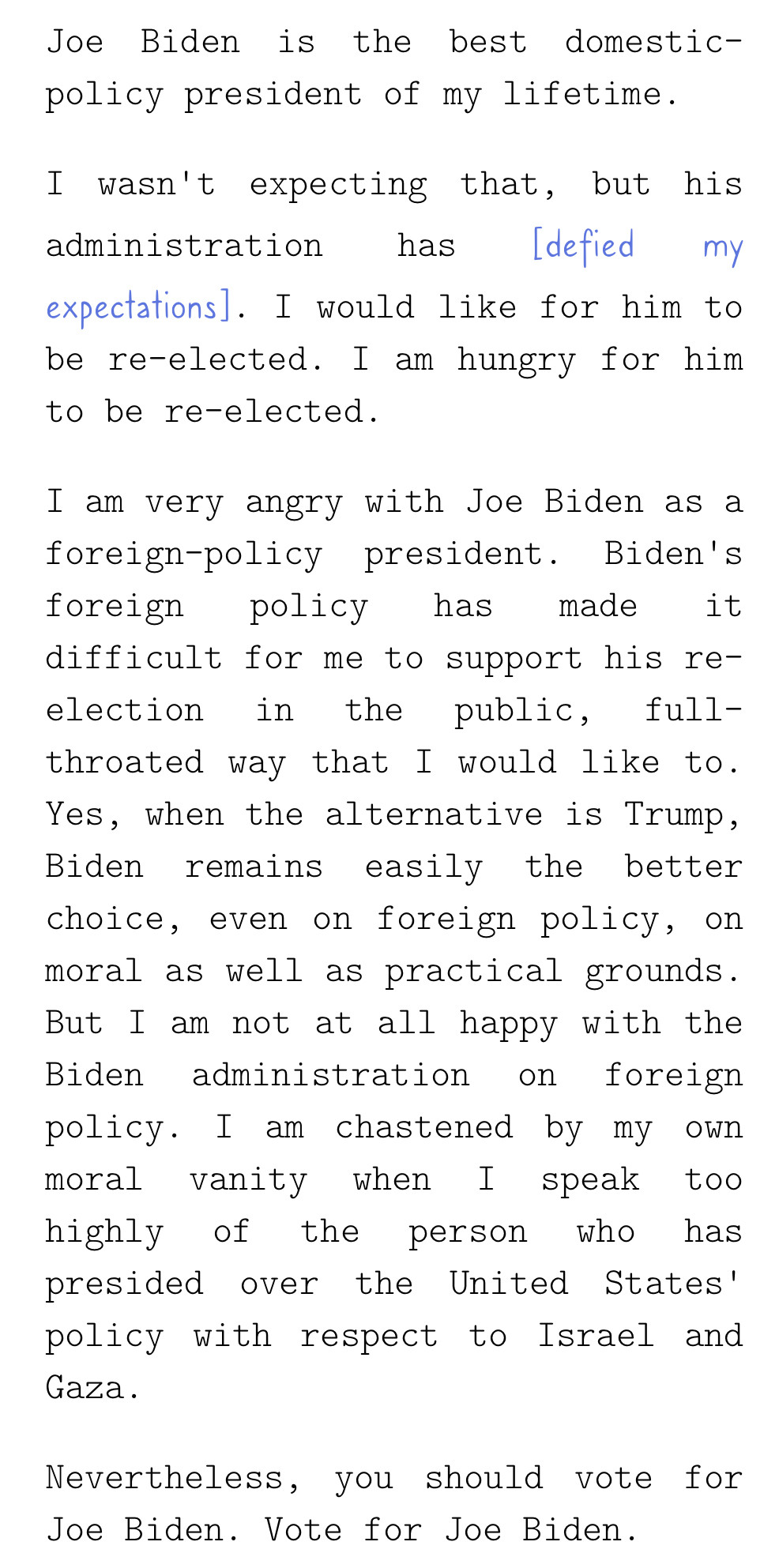 i’m not interested in organizing people into caricatures like “the left”, but Gaza. lots of people of goodwill who really would have appreciates Biden’s economic work had a hard time saying nice things because Gaza. here’s me: drafts.interfluidity.com/2024/06/10/a...