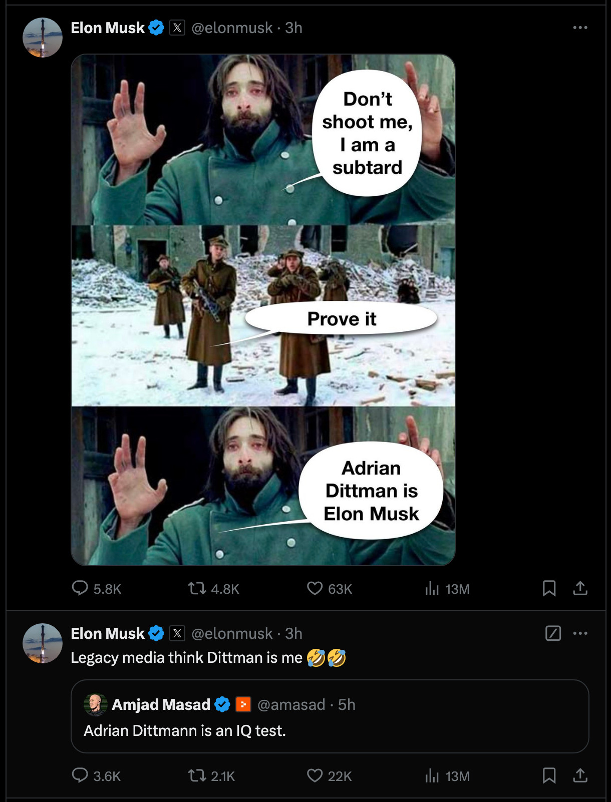 assuming we are right (i'm pretty sure we are right!) that Dittman is Musk, i don't know what to do with an epistemological environment in which one of the world's most powerful men and most prominent speakers does this.