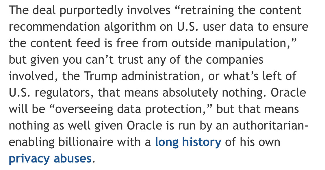 Text: The deal purportedly involves "retraining the content recommendation algorithm on U.S. user data to ensure the content feed is free from outside manipulation," but given you can't trust any of the companies involved, the Trump administration, or what's left of U.S. regulators, that means absolutely nothing. Oracle will be "overseeing data protection," but that means nothing as well given Oracle is run by an authoritarian-enabling billionaire with a long history of his own privacy abuses.