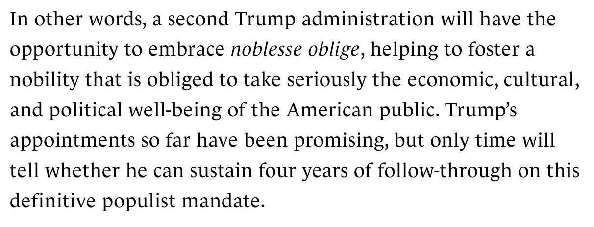 Text: In other words, a second Trump administration will have the opportunity to embrace noblesse oblige, helping to foster a nobility that is obliged to take seriously the economic, cultural, and political well-being of the American public. Trump’s appointments so far have been promising, but only time will tell whether he can sustain four years of follow-through on this definitive populist mandate.