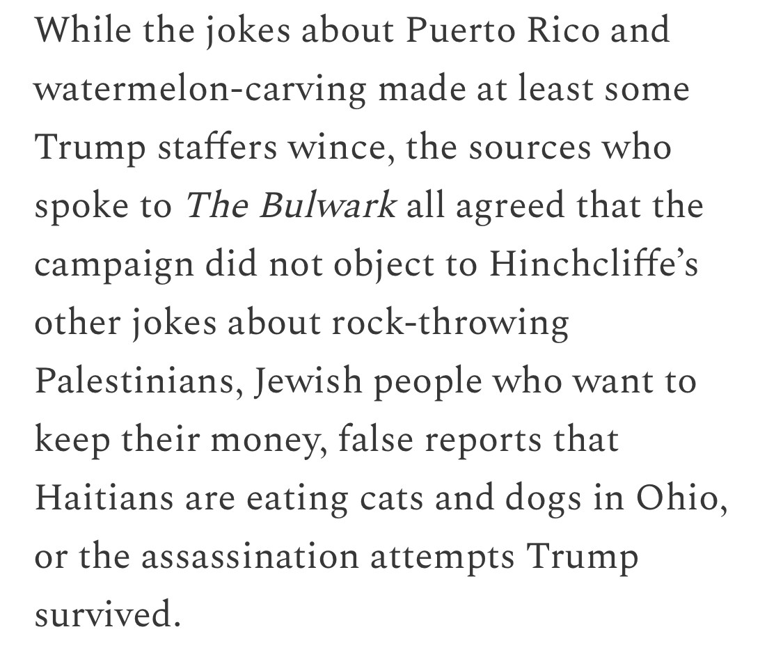 Text: While the jokes about Puerto Rico and watermelon-carving made at least some Trump staffers wince, the sources who spoke to The Bulwark all agreed that the campaign did not object to Hinchcliffe's other jokes about rock-throwing Palestinians, Jewish people who want to keep their money, false reports that Haitians are eating cats and dogs in Ohio, or the assassination attempts Trump survived.