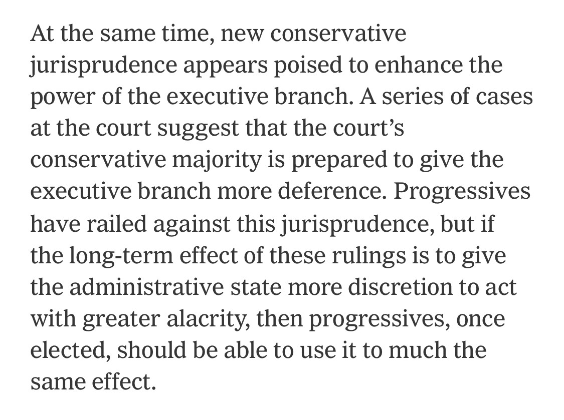 To say progressives might repurpose this for their own ends (i) ignores the Court’s obvious double standard, it offered Biden no such deference; and (ii) defies the core of the progressive project, which was to build an administrative state somewhat insulated from presidential politics + whim. /fin