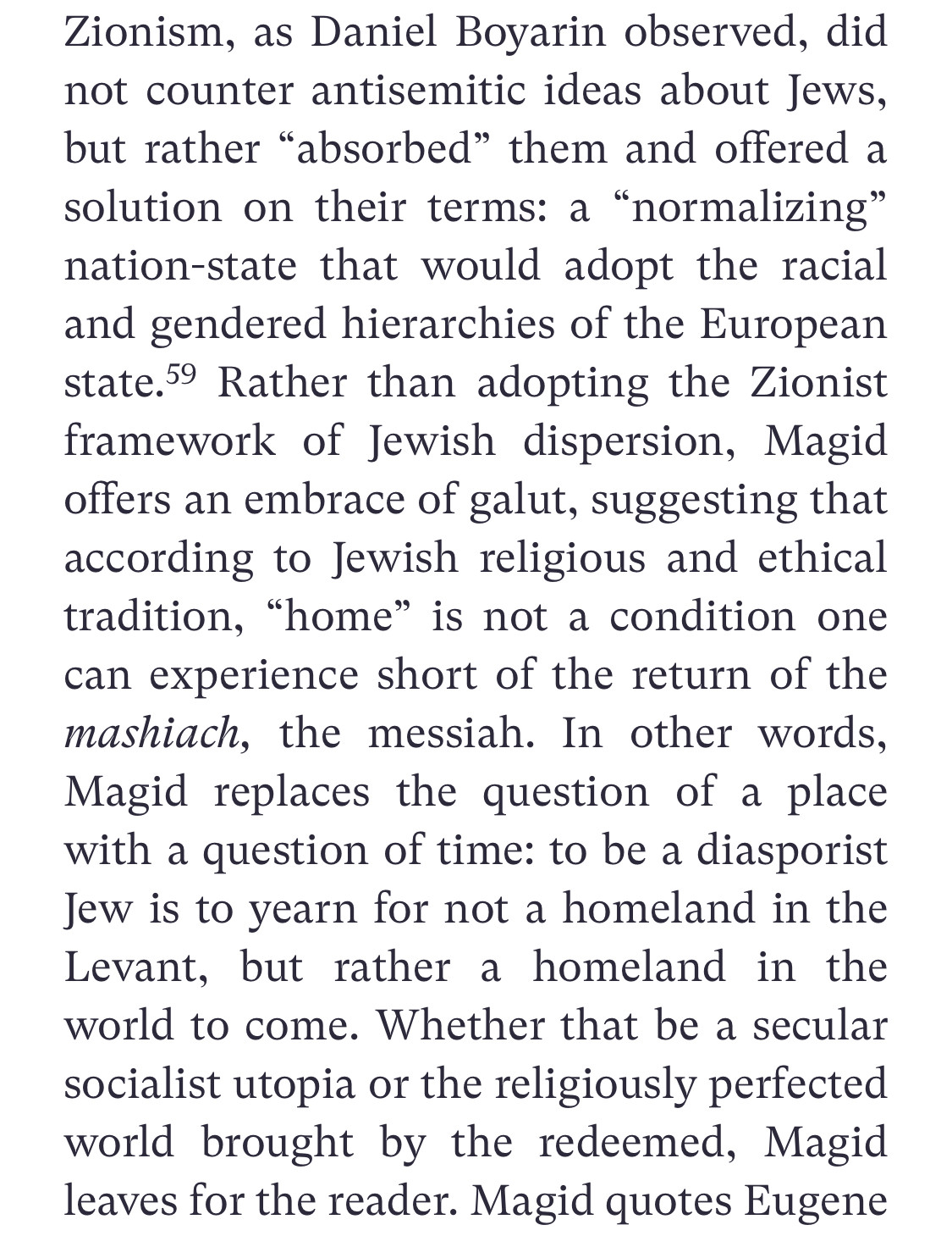 Text: Zionism, as Daniel Boyarin observed, did not counter antisemitic ideas about Jews, but rather "absorbed" them and offered a solution on their terms: a "normalizing" nation-state that would adopt the racial and gendered hierarchies of the European state.59 Rather than adopting the Zionist framework of Jewish dispersion, Magid offers an embrace of galut, suggesting that according to Jewish religious and ethical tradition, "home" is not a condition one can experience short of the return of the mashiach, the messiah. In other words, Magid replaces the question of a place with a question of time: to be a diasporist Jew is to yearn for not a homeland in the Levant, but rather a homeland in the world to come. Whether that be a secular socialist utopia or the religiously perfected world brought by the redeemed, Magid leaves for the reader.