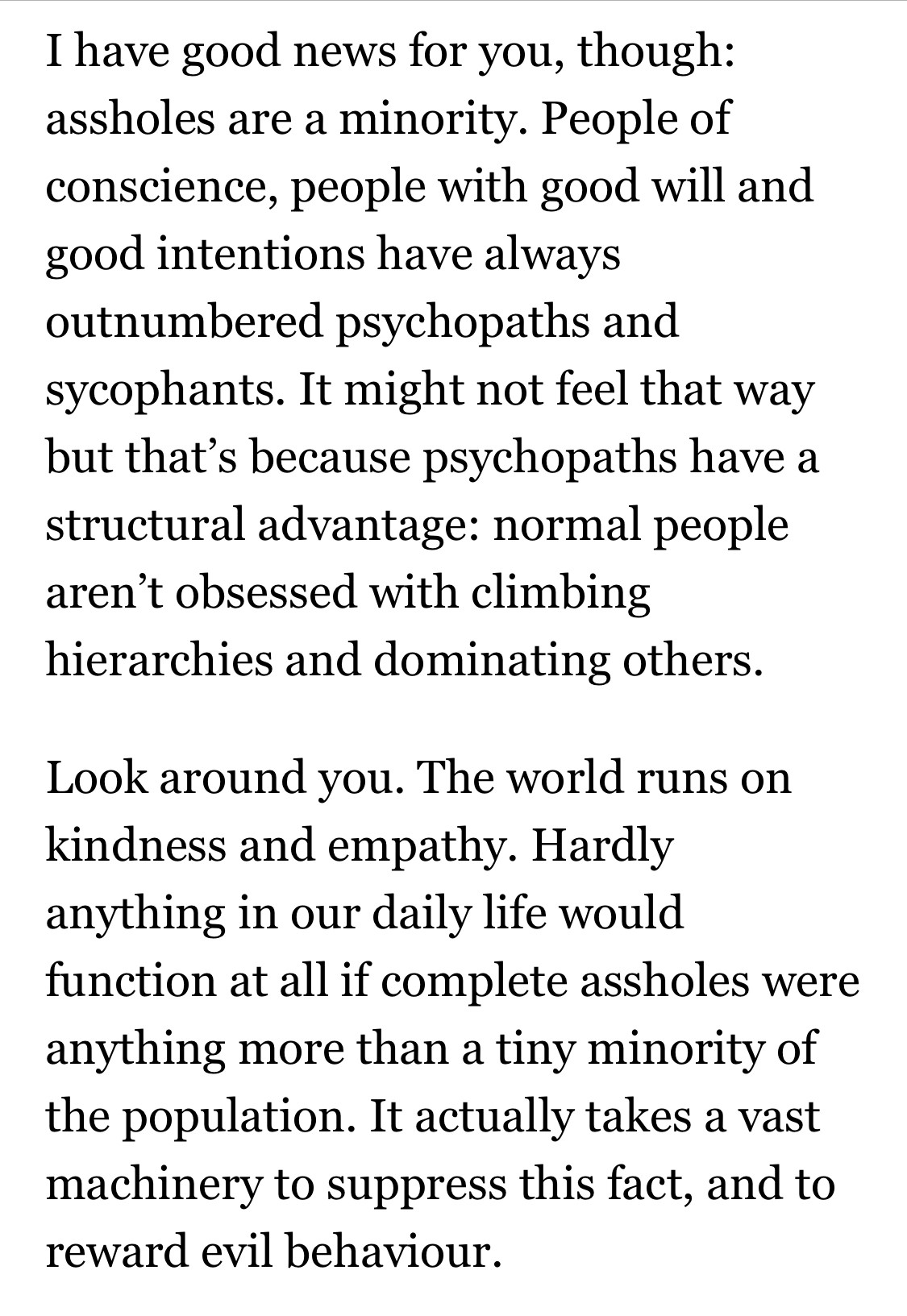 Text: I have good news for you, though: assholes are a minority. People of conscience, people with good will and good intentions have always outnumbered psychopaths and sycophants. It might not feel that way but that's because psychopaths have a structural advantage: normal people aren't obsessed with climbing hierarchies and dominating others. Look around you. The world runs on kindness and empathy. Hardly anything in our daily life would function at all if complete assholes were anything more than a tiny minority of the population. It actually takes a vast machinery to suppress this fact, and to reward evil behaviour.