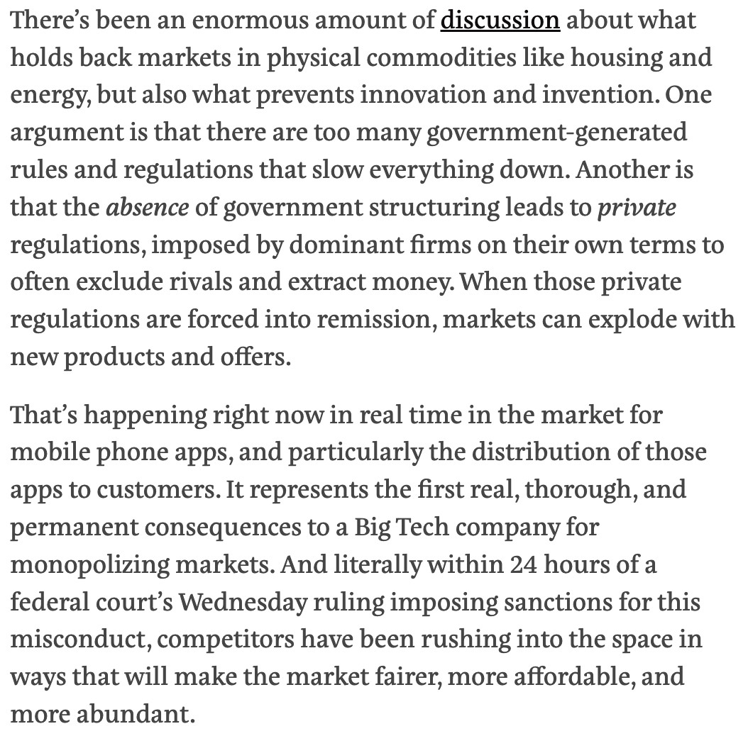 Text: There’s been an enormous amount of discussion about what holds back markets in physical commodities like housing and energy, but also what prevents innovation and invention. One argument is that there are too many government-generated rules and regulations that slow everything down. Another is that the absence of government structuring leads to private regulations, imposed by dominant firms on their own terms to often exclude rivals and extract money. When those private regulations are forced into remission, markets can explode with new products and offers. That’s happening right now in real time in the market for mobile phone apps, and particularly the distribution of those apps to customers. It represents the first real, thorough, and permanent consequences to a Big Tech company for monopolizing markets. And literally within 24 hours of a federal court’s Wednesday ruling imposing sanctions for this misconduct, competitors have been rushing into the space in ways that will make the market fairer, more affordable, and more abundant.
