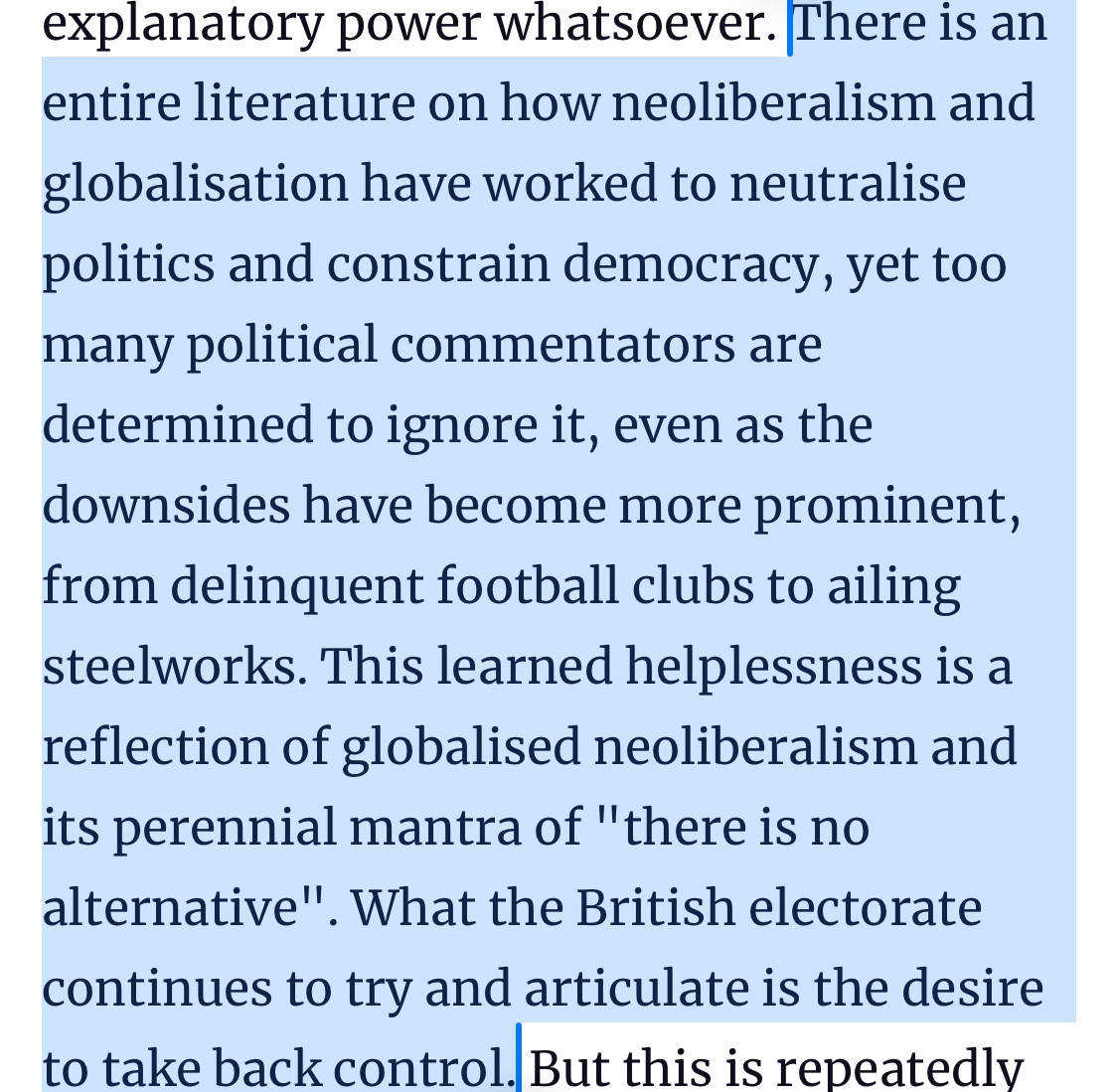 Text: There is an entire literature on how neoliberalism and globalisation have worked to neutralise politics and constrain democracy, yet too many political commentators are determined to ignore it, even as the downsides have become more prominent, from delinquent football clubs to ailing steelworks. This learned helplessness is a reflection of globalised neoliberalism and its perennial mantra of "there is no alternative". What the British electorate continues to try and articulate is the desire to take back control.