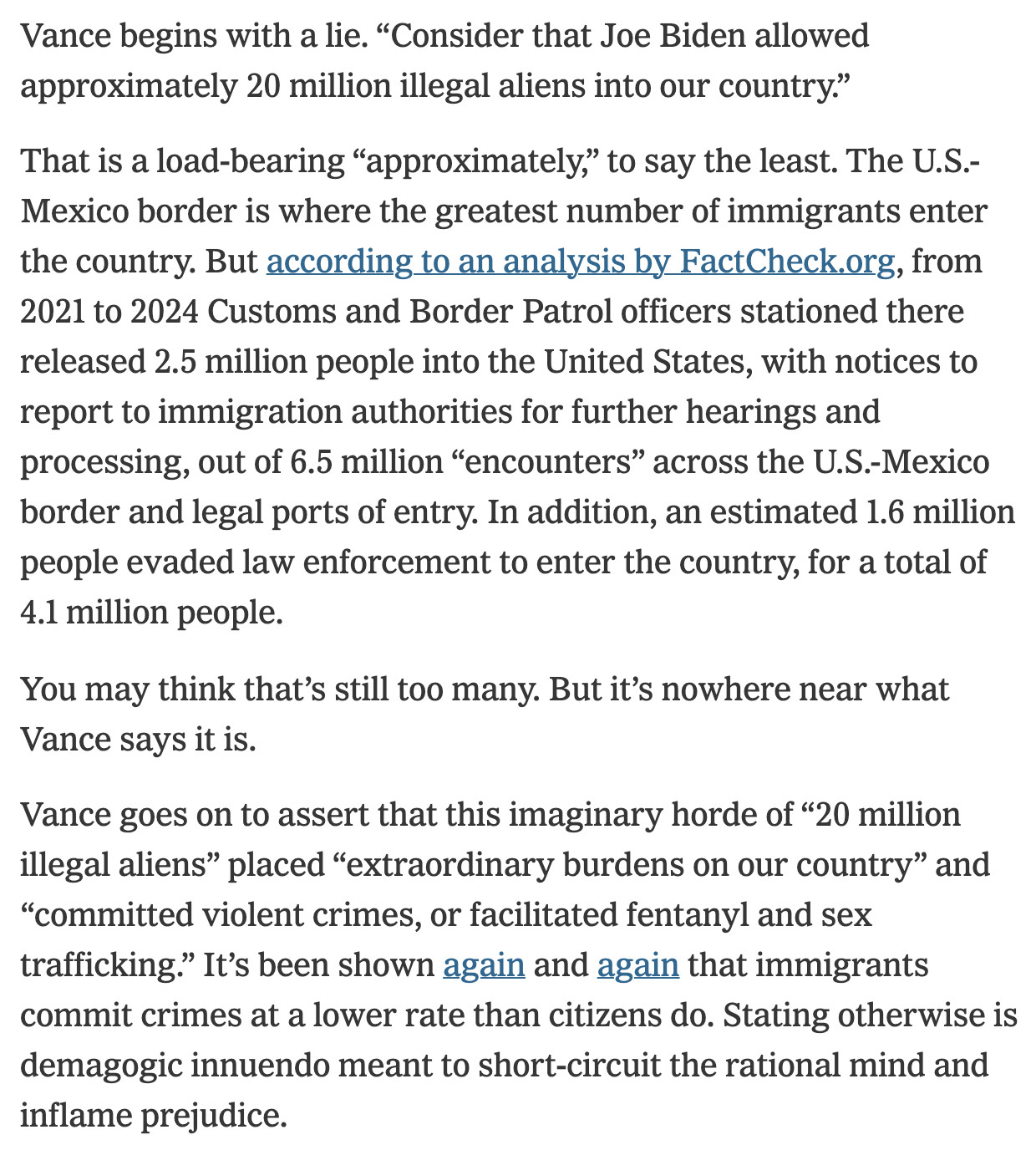 Text: Vance begins with a lie. “Consider that Joe Biden allowed approximately 20 million illegal aliens into our country.” That is a load-bearing “approximately,” to say the least. The U.S.-Mexico border is where the greatest number of immigrants enter the country. But according to an analysis by FactCheck.org, from 2021 to 2024 Customs and Border Patrol officers stationed there released 2.5 million people into the United States, with notices to report to immigration authorities for further hearings and processing, out of 6.5 million “encounters” across the U.S.-Mexico border and legal ports of entry. In addition, an estimated 1.6 million people evaded law enforcement to enter the country, for a total of 4.1 million people. You may think that’s still too many. But it’s nowhere near what Vance says it is. Vance goes on to assert that this imaginary horde of “20 million illegal aliens” placed “extraordinary burdens on our country” and “committed violent crimes, or facilitated fentanyl and sex trafficking.” It’s been shown again and again that immigrants commit crimes at a lower rate than citizens do. Stating otherwise is demagogic innuendo meant to short-circuit the rational mind and inflame prejudice.