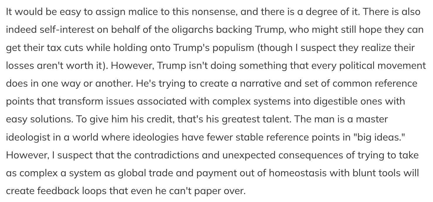 Text: It would be easy to assign malice to this nonsense, and there is a degree of it. There is also indeed self-interest on behalf of the oligarchs backing Trump, who might still hope they can get their tax cuts while holding onto Trump's populism (though I suspect they realize their losses aren't worth it). However, Trump isn't doing something that every political movement does in one way or another. He's trying to create a narrative and set of common reference points that transform issues associated with complex systems into digestible ones with easy solutions. To give him his credit, that's his greatest talent. The man is a master ideologist in a world where ideologies have fewer stable reference points in "big ideas." However, I suspect that the contradictions and unexpected consequences of trying to take as complex a system as global trade and payment out of homeostasis with blunt tools will create feedback loops that even he can't paper over.