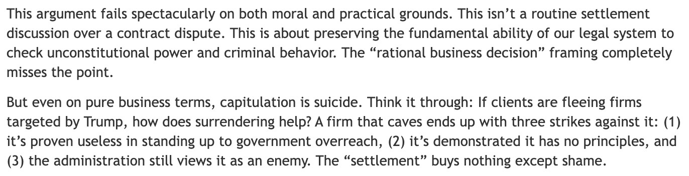 Text: This argument fails spectacularly on both moral and practical grounds. This isn’t a routine settlement discussion over a contract dispute. This is about preserving the fundamental ability of our legal system to check unconstitutional power and criminal behavior. The “rational business decision” framing completely misses the point. But even on pure business terms, capitulation is suicide. Think it through: If clients are fleeing firms targeted by Trump, how does surrendering help? A firm that caves ends up with three strikes against it: (1) it’s proven useless in standing up to government overreach, (2) it’s demonstrated it has no principles, and (3) the administration still views it as an enemy. The “settlement” buys nothing except shame.
