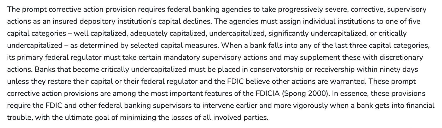 Text: The prompt corrective action provision requires federal banking agencies to take progressively severe, corrective, supervisory actions as an insured depository institution's capital declines. The agencies must assign individual institutions to one of five capital categories – well capitalized, adequately capitalized, undercapitalized, significantly undercapitalized, or critically undercapitalized – as determined by selected capital measures. When a bank falls into any of the last three capital categories, its primary federal regulator must take certain mandatory supervisory actions and may supplement these with discretionary actions. Banks that become critically undercapitalized must be placed in conservatorship or receivership within ninety days unless they restore their capital or their federal regulator and the FDIC believe other actions are warranted. These prompt corrective action provisions are among the most important features of the FDICIA (Spong 2000). In essence, these provisions require the FDIC and other federal banking supervisors to intervene earlier and more vigorously when a bank gets into financial trouble, with the ultimate goal of minimizing the losses of all involved parties.