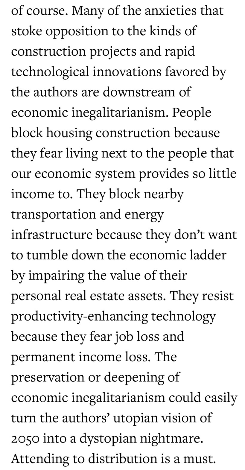 Text: Many of the anxieties that stoke opposition to the kinds of construction projects and rapid technological innovations favored by the authors are downstream of economic inegalitarianism. People block housing construction because they fear living next to the people that our economic system provides so little income to. They block nearby transportation and energy infrastructure because they don’t want to tumble down the economic ladder by impairing the value of their personal real estate assets. They resist productivity-enhancing technology because they fear job loss and permanent income loss. The preservation or deepening of economic inegalitarianism could easily turn the authors’ utopian vision of 2050 into a dystopian nightmare. Attending to distribution is a must.