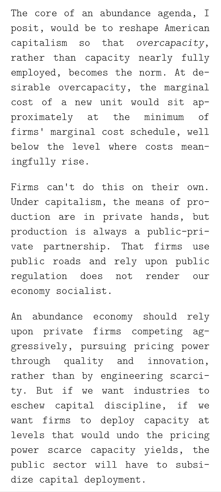 Text: The core of an abundance agenda, I posit, would be to reshape American capitalism so that overcapacity, rather than capacity nearly fully employed, becomes the norm. At desirable overcapacity, the marginal cost of a new unit would sit approximately at the minimum of firms' marginal cost schedule, well below the level where costs meaningfully rise. Firms can't do this on their own. Under capitalism, the means of production are in private hands, but production is always a public-private partnership. That firms use public roads and rely upon public regulation does not render our economy socialist. An abundance economy should rely upon private firms competing aggressively, pursuing pricing power through quality and innovation, rather than by engineering scarcity. But if we want industries to eschew capital discipline, if we want firms to deploy capacity at levels that would undo the pricing power scarce capacity yields, the public sector will have to subsidize capital deployment.