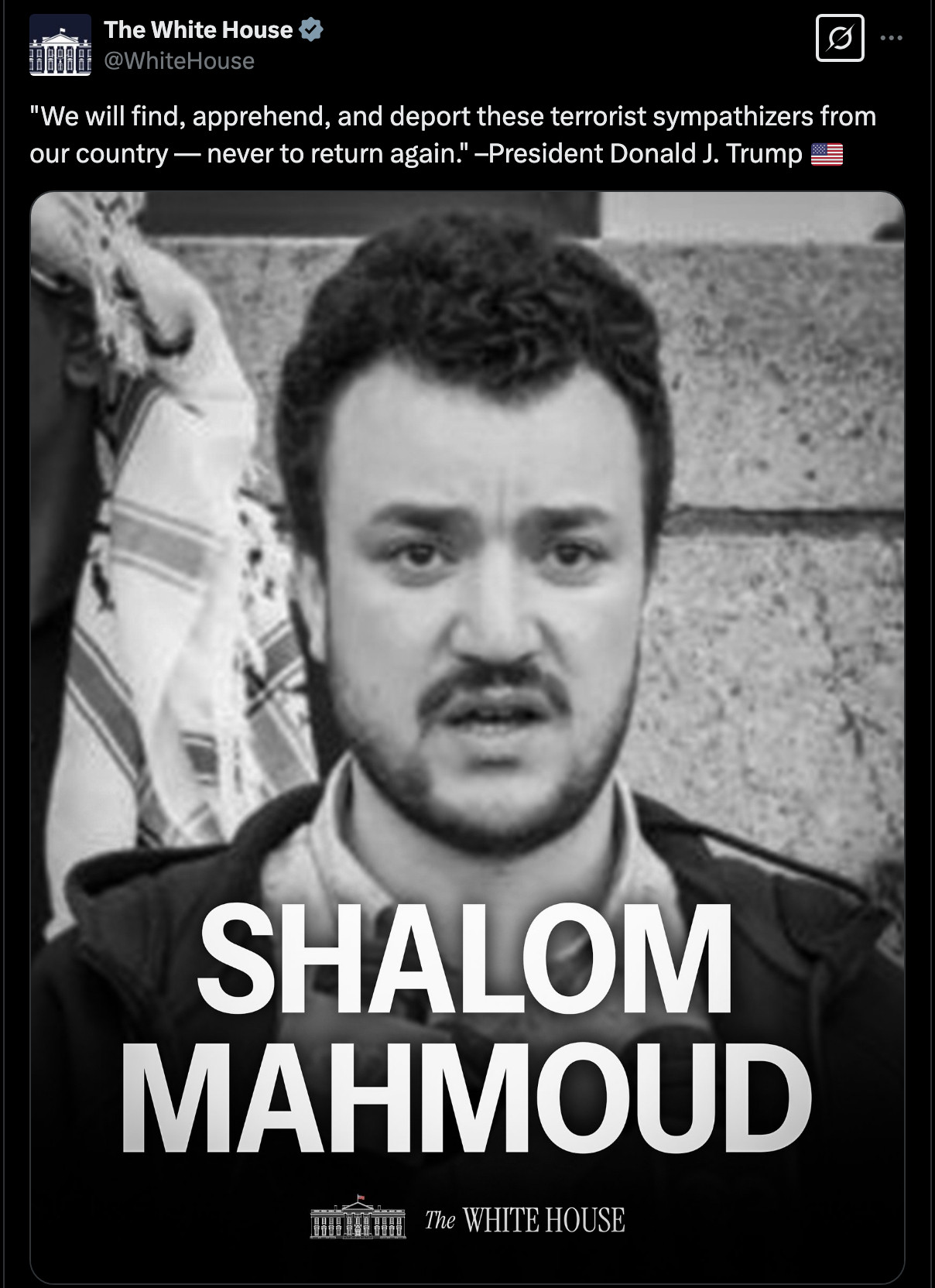 Tweet from The White House saying "Shalom Mahmoud", over a photograph of the lawlessly detained Mahmoud Khalil. The text portion reads "'We will find, apprehend, and deport these terrorist sympathizers from our country — never to return again.' –President Donald J. Trump 🇺🇸"