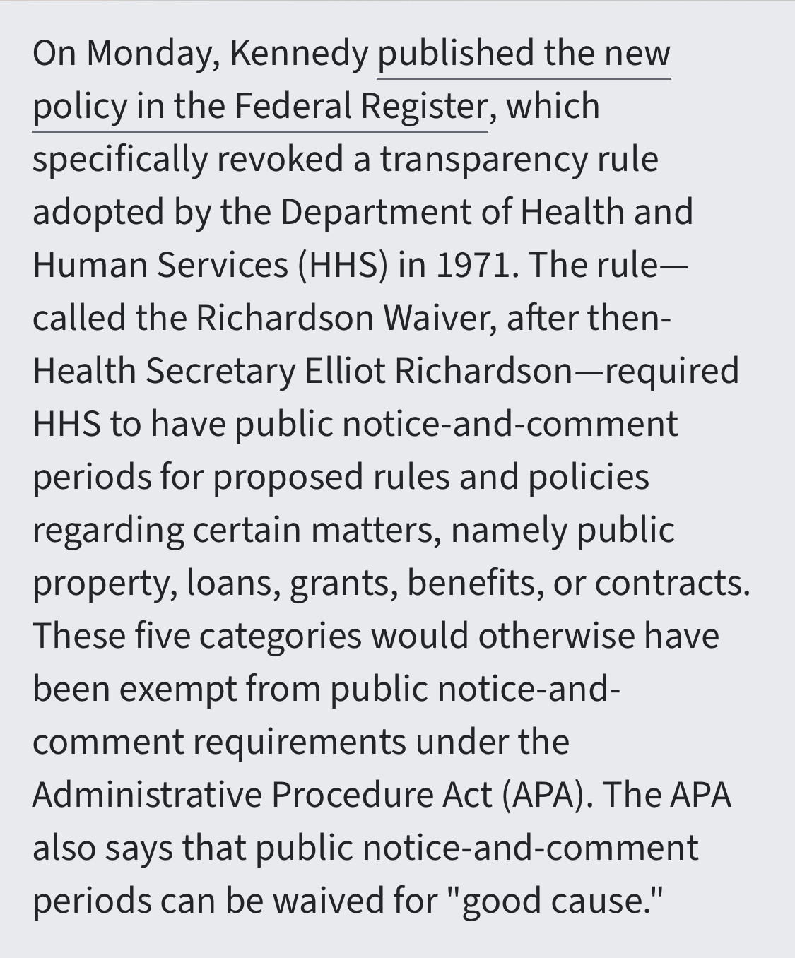 Text: On Monday, Kennedy published the new policy in the Federal Register, which specifically revoked a transparency rule adopted by the Department of Health and Human Services (HHS) in 1971. The rule—called the Richardson Waiver, after then-Health Secretary Elliot Richardson—required HHS to have public notice-and-comment periods for proposed rules and policies regarding certain matters, namely public property, loans, grants, benefits, or contracts. These five categories would otherwise have been exempt from public notice-and-comment requirements under the Administrative Procedure Act (APA). The APA also says that public notice-and-comment periods can be waived for "good cause."