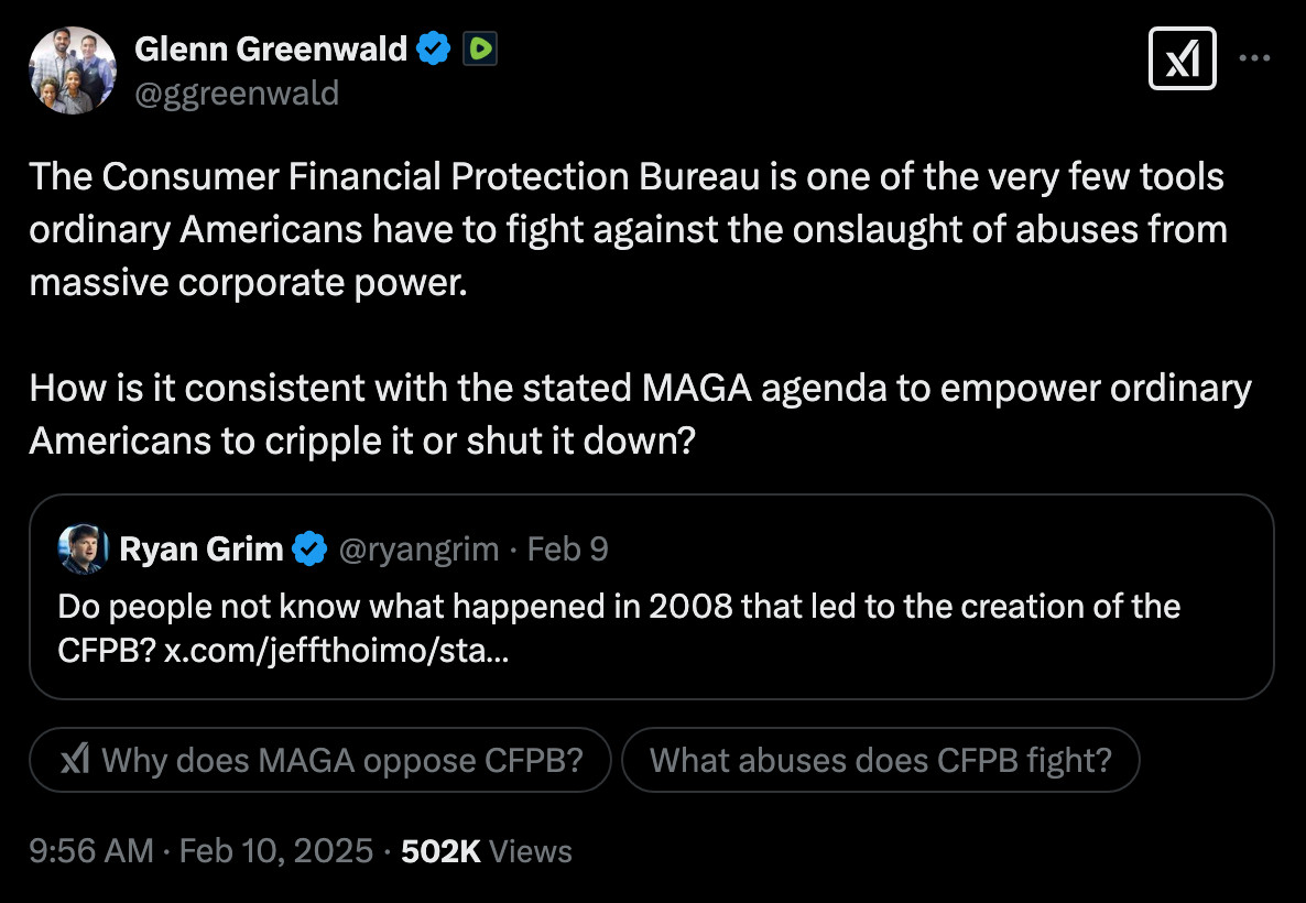 Screenshot of tweet from Glenn Greenwald: Text: The Consumer Financial Protection Bureau is one of the very few tools ordinary Americans have to fight against the onslaught of abuses from massive corporate power. How is it consistent with the stated MAGA agenda to empower ordinary Americans to cripple it or shut it down?