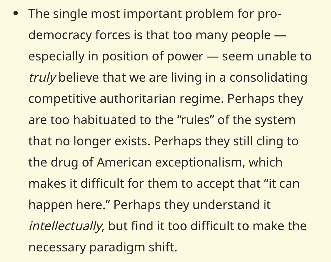 Text: The single most important problem for pro-democracy forces is that too many people — especially in position of power — seem unable to truly believe that we are living in a consolidating competitive authoritarian regime. Perhaps they are too habituated to the "rules" of the system that no longer exists. Perhaps they still cling to the drug of American exceptionalism, which makes it difficult for them to accept that "it can happen here." Perhaps they understand it intellectually, but find it too difficult to make the necessary paradigm shift.