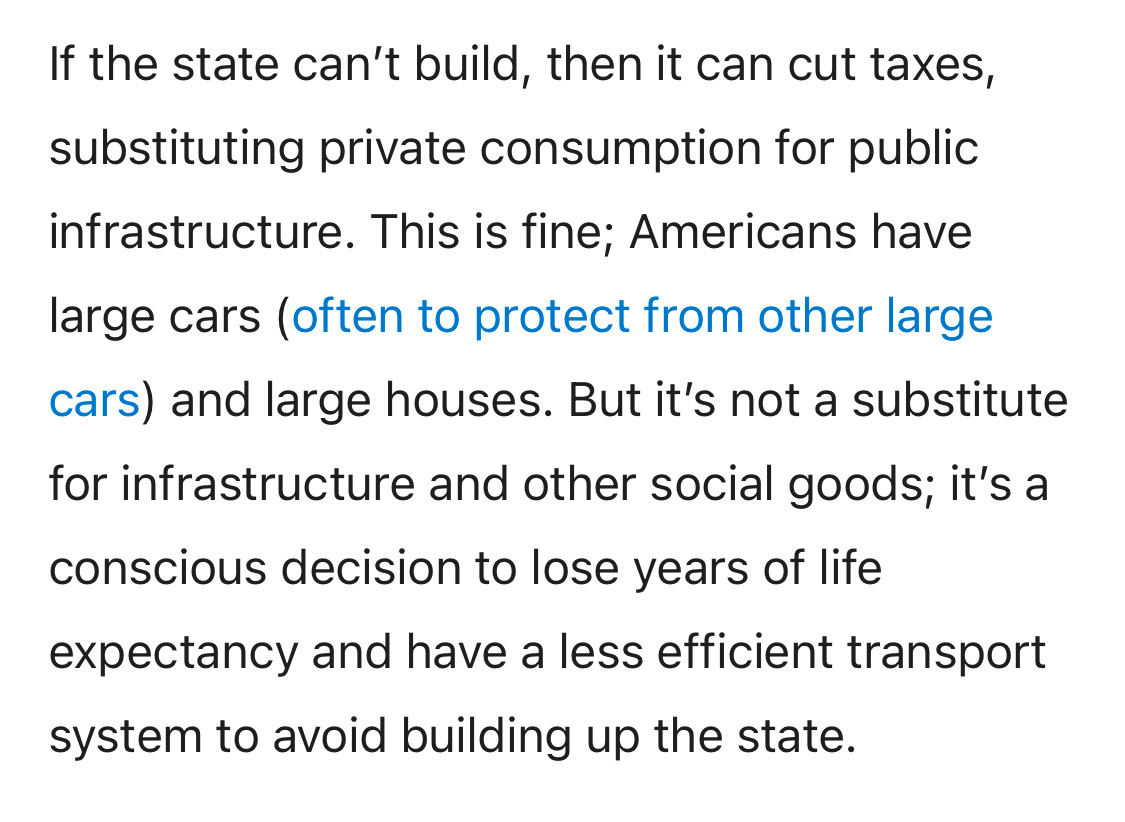 Text: If the state can't build, then it can cut taxes, substituting private consumption for public infrastructure. This is fine; Americans have large cars (often to protect from other large cars) and large houses. But it's not a substitute for infrastructure and other social goods; it's a conscious decision to lose years of life expectancy and have a less efficient transport system to avoid building up the state.