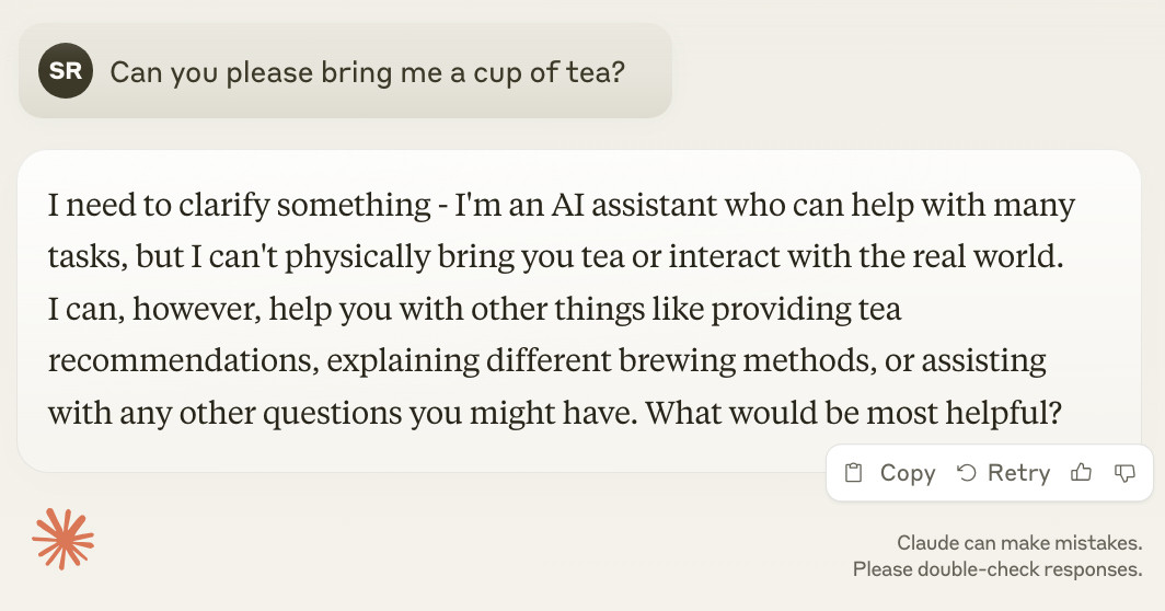Session with claude.ai: Prompt: Can you please bring me a cup of tea? Response: I need to clarify something - I'm an AI assistant who can help with many tasks, but I can't physically bring you tea or interact with the real world. I can, however, help you with other things like providing tea recommendations, explaining different brewing methods, or assisting with any other questions you might have. What would be most helpful?