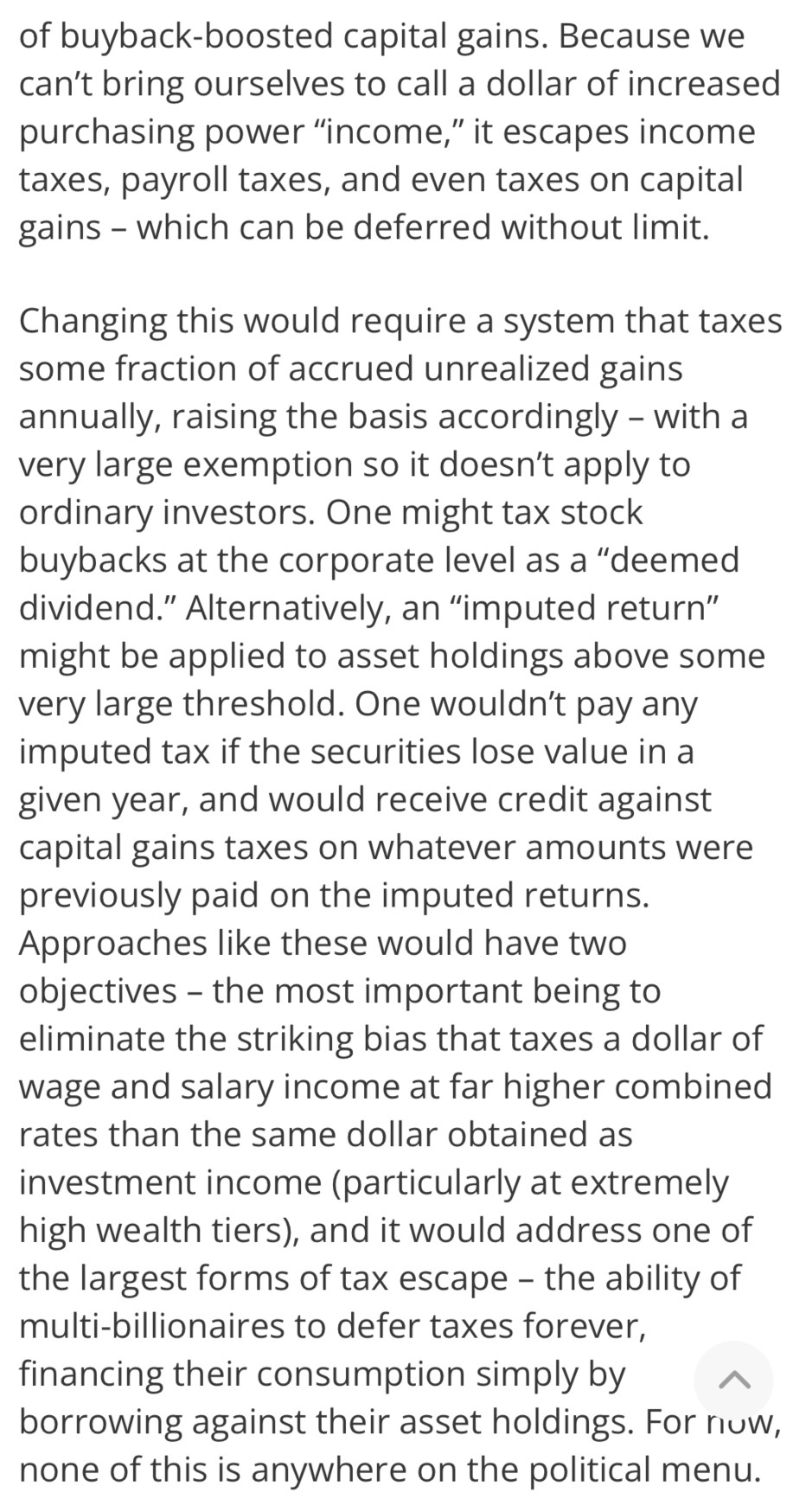 Text: Because we can't bring ourselves to call a dollar of increased purchasing power "income," it escapes income taxes, payroll taxes, and even taxes on capital gains - which can be deferred without limit. Changing this would require a system that taxes some fraction of accrued unrealized gains annually, raising the basis accordingly - with a very large exemption so it doesn't apply to ordinary investors. One might tax stock buybacks at the corporate level as a "deemed dividend." Alternatively, an "imputed return" might be applied to asset holdings above some very large threshold. One wouldn't pay any imputed tax if the securities lose value in a given year, and would receive credit against capital gains taxes on whatever amounts were previously paid on the imputed returns. Approaches like these would have two objectives - the most important being to eliminate the striking bias that taxes a dollar of wage and salary income at far higher combined rates than the same dollar obtained as investment income (particularly at extremely high wealth tiers), and it would address one of the largest forms of tax escape - the ability of multi-billionaires to defer taxes forever, financing their consumption simply by borrowing against their asset holdings. For now, none of this is anywhere on the political menu.