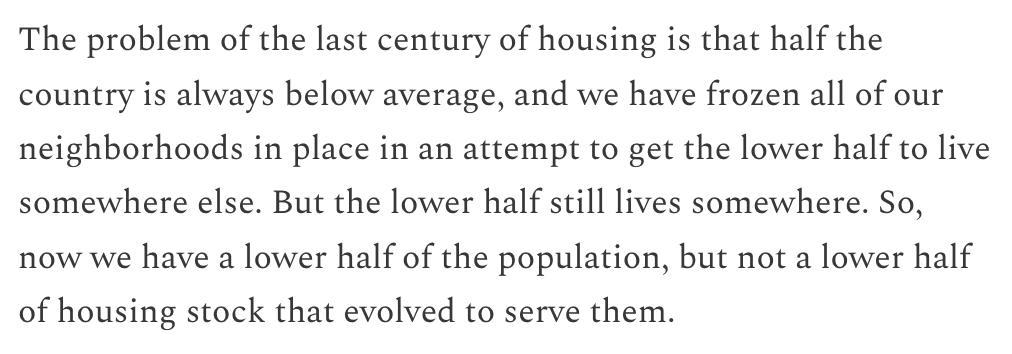 The problem of the last century of housing is that half the country is always below average, and we have frozen all of our neighborhoods in place in an attempt to get the lower half to live somewhere else. But the lower half still lives somewhere. So, now we have a lower half of the population, but not a lower half of housing stock that evolved to serve them.
