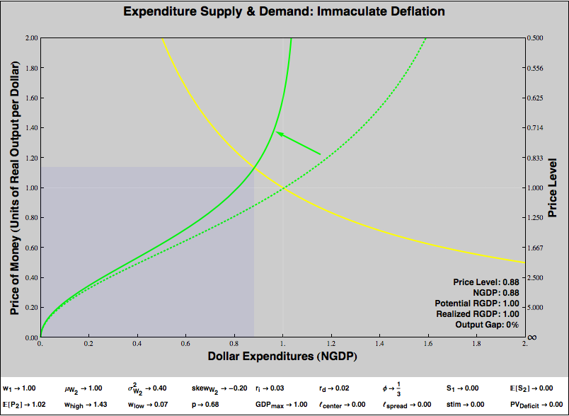It’s worth commenting on how the shape of the expenditure demand curve as it shifts in response to a supply shock. By hypothesis, the “kink” in the curve is a function of nominal indebtedness. A firm that requires a dollar of revenue to service its debts doesn’t reduce the price of its total output below a dollar, even if a technology shock diminishes the quantity or quality of that output. So the kink stays where it began, at nominal expenditure of 1.