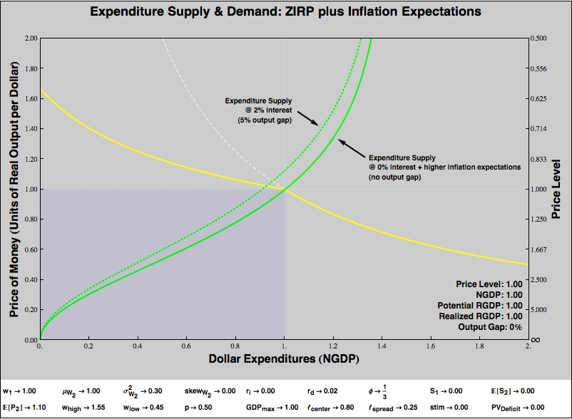 (Note: If you think transfers that will never be paid for in taxes must increase the expected future price level, then in the immediate term, all that does is to reduce the scale of the program necessary to eliminate the output gap! An increase future price level expectations, like the unfinanced transfer itself, renders the expenditure supply curve shallower, helping carry our equilibrium out of the recession region. Of course, we are observing a one period snapshot of the economy, and there may be long-term bad consequences to “unanchoring” the price level. That’s beyond the scope of our little visualization, but that doesn’t mean we shouldn’t worry about it.)